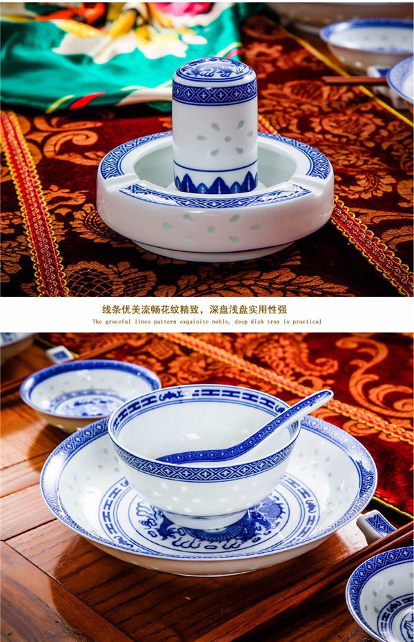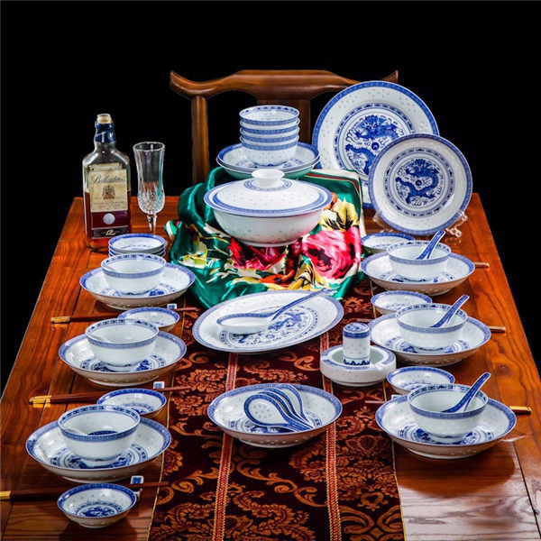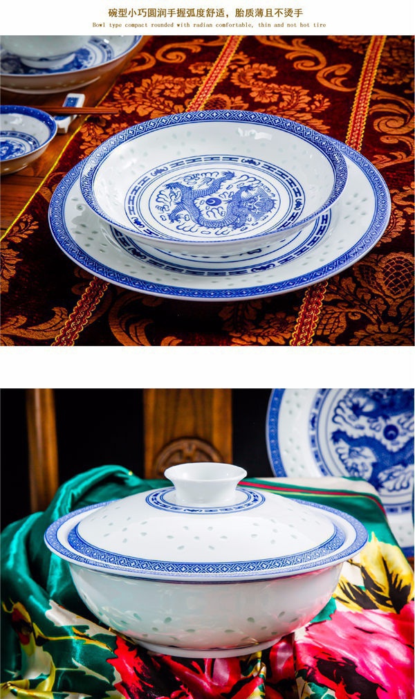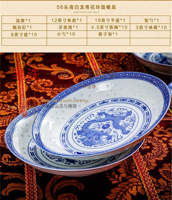 56頭高白龍的青花玲瓏餐具,一個湯煲,一個魚盤,一個十寸圓盤,一個飯勺,一個煙缸,一個牙簽筒,十個4.5寸飯碗,十個三寸碟,十個八寸盤,十個調(diào)羹,十個筷子架。56頭高白龍的青花玲瓏餐具,一個湯煲,一個魚盤,一個十寸圓盤,一個飯勺,一個煙缸,一個牙簽筒,十個4.5寸飯碗,十個三寸碟,十個八寸盤,十個調(diào)羹,十個筷子架。