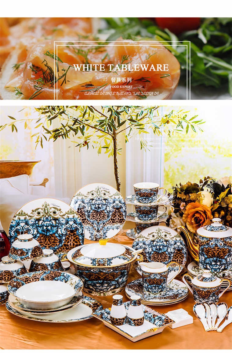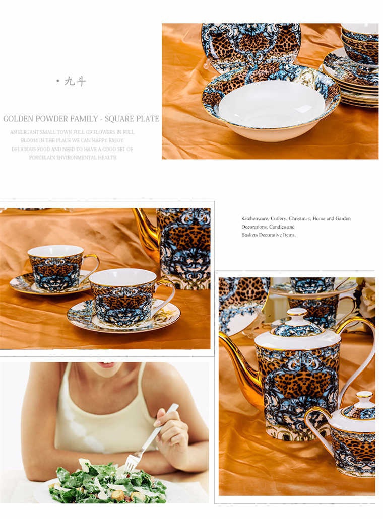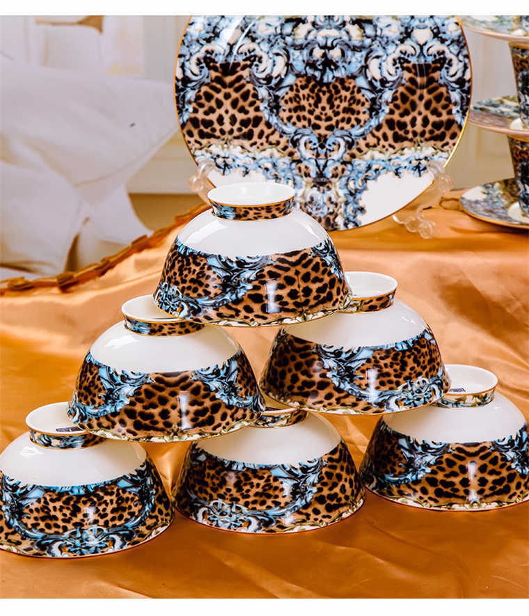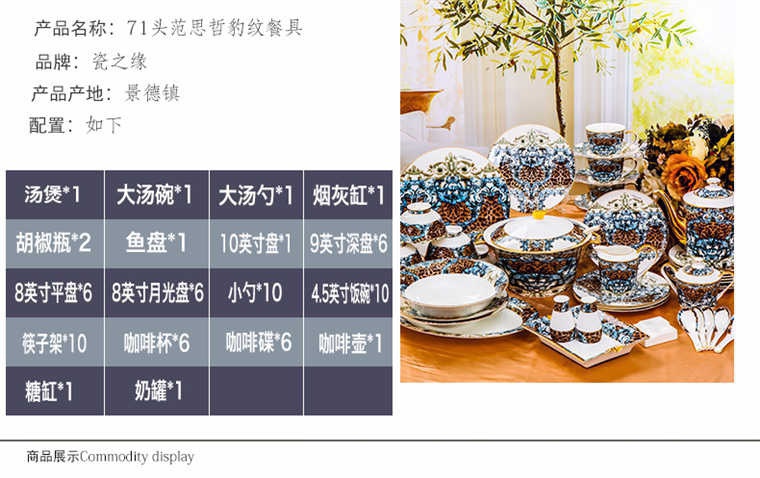 71頭范思哲豹紋餐具,一個湯煲,一個大湯碗,一個大湯勺,一個煙缸,兩個胡椒瓶,一個魚盤,一個10寸盤,六個9寸深盤,六個8寸平盤,六個8寸月光盤,十個4.5寸飯碗,十個小勺,十個筷子架,一個咖啡壺,一個糖缸,一個奶罐,六個咖啡杯,六個碟。